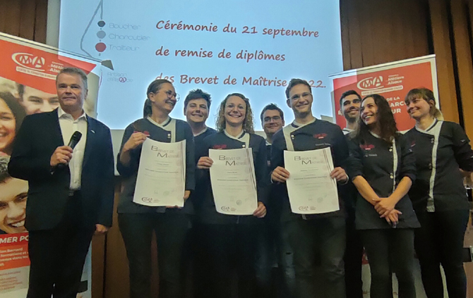 Le mercredi 21 septembre dernier a eu lieu au CFA d'Eschau un des événements phares de la profession, la remise des diplômes des lauréats du brevet de Maîtrise boucher charcutier traiteur 2022.